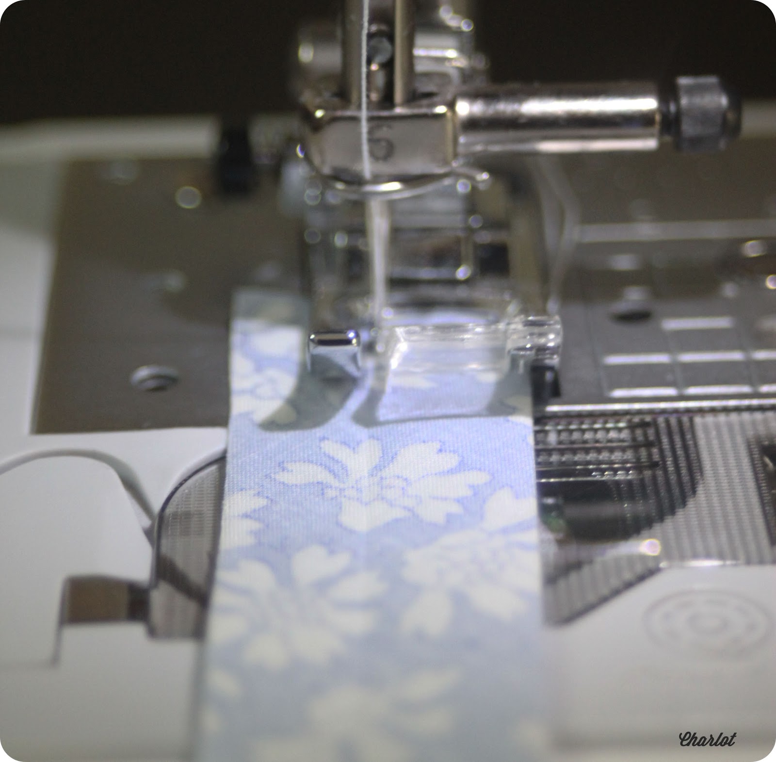 1- Ouvrer le biais en le repassant, puis plier le biais en deux endroit contre endroit.